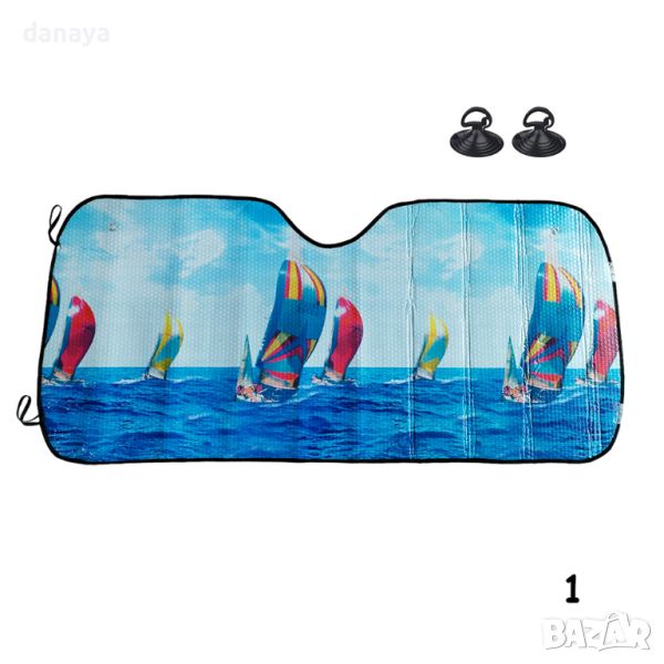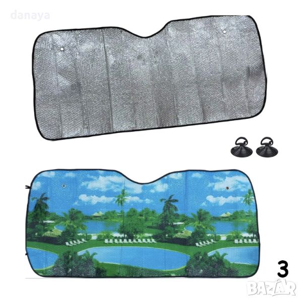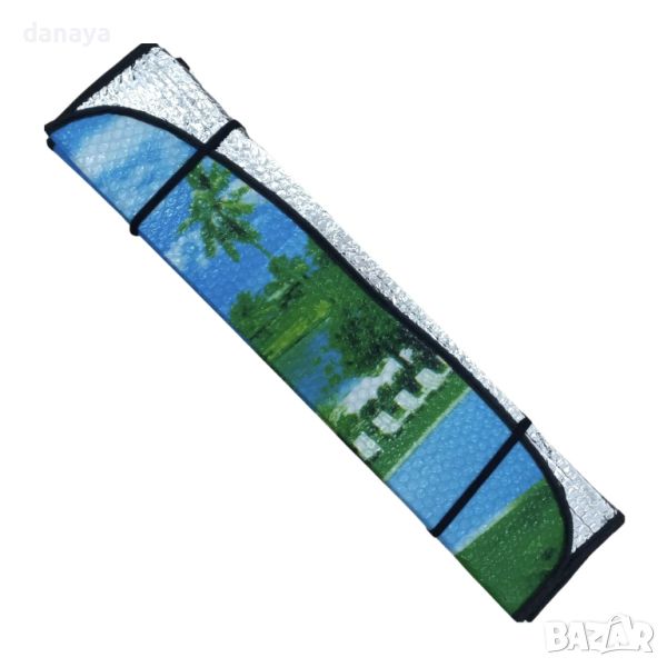 сенник за кола с цветни пейзажи. Сенник за предно стъкло на автомобил. Преден сенник за кола. Универсален сенник подходящ за всички видове автомобили. Идеална защита през летния сезон. През лятото намалява загряването в купето на автомобила, волана и таблото. UV защита. Закрепването е с вакуум държачи на стъклото, включени в комплека (2бр.).