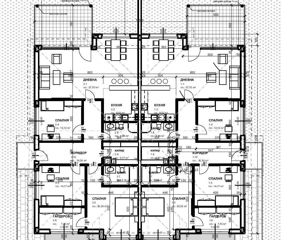 Село Труд. Предлагам ви предстоящ строеж на 2 къщи в източната част на селото. Къщите са на калкан тип близнаци, едноетажни. Всяка една е с площ 185кв.м. и към нея има прилежащ двор от 500кв.м. Разпределението е функционално и се състои от 3 спални, едната от които с дрешник, 2 бани с тоалетни, хол с трапезария и кухненски бокс и веранда. Пред всяка къща са предвидени паркоместа. Канализация!