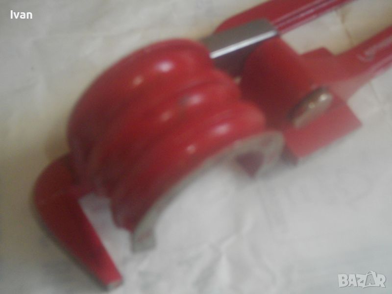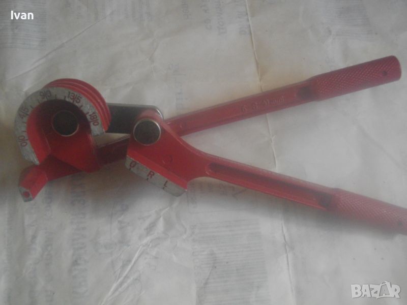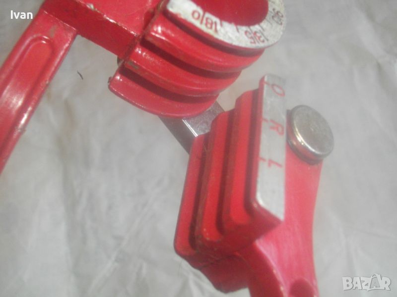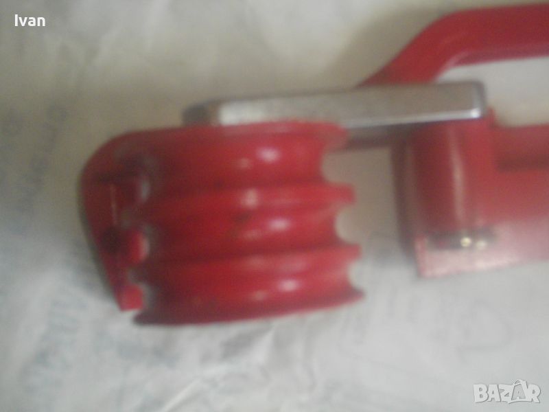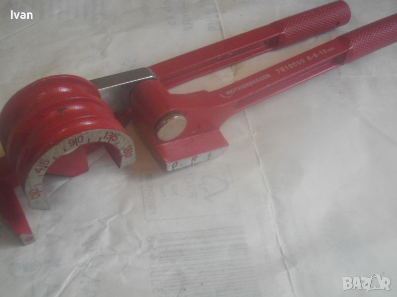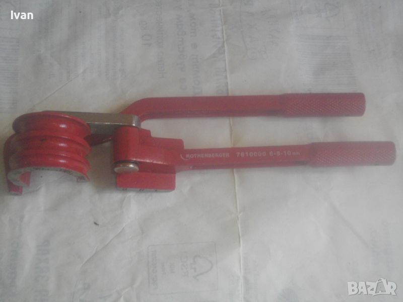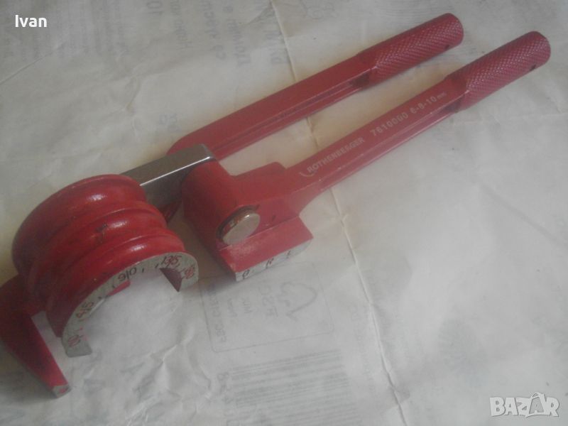 Нов червен тръбогиб размер 6-8-10 мм - троен - ROTHENBERGER 7610000. Цена 159 лв. Немски оригинален промишлен/индустриален/професионален. За огъване тръби без дебелостенни метални размери за огъване 6 мм, 8 мм, 10 мм - главата е тройна. ССъвсем нов, неизползван. Прецизна глава алуминиева, оразмерена 0-180 градуса, през 15 градуса. Радиус огъване 30 мм. Дължина инструмент 270 мм, ширина 95 мм, оребрени метални дръжки. Материал - алумин и стомана. Тегло - 0,5 кг.
