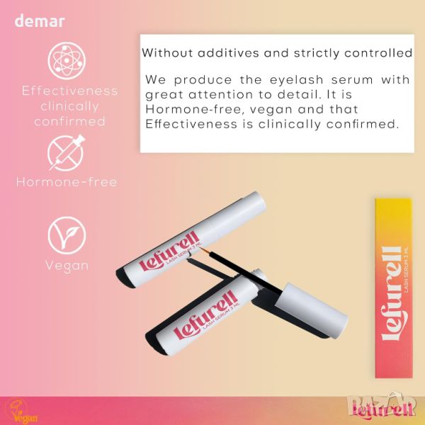 LEFURELL Eyelash Growth Серум за мигли, по-дълги, плътни и по-здрави мигли, без хормони, веган, 3 мл