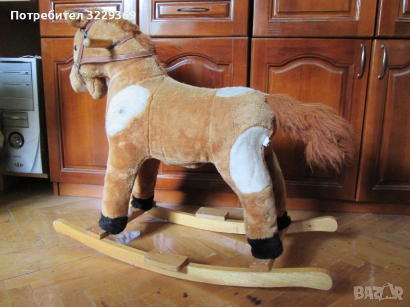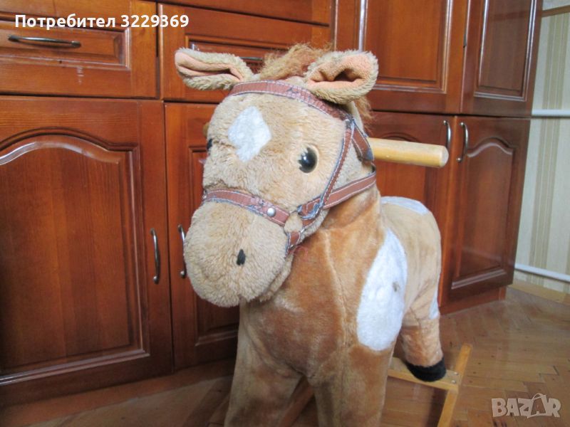 в кафяв цвят със седло, юзди и звук. Кончето е изработено със стабилна заоблена основа от дърво, с чиято помощ детето ще се люлее, а дръжките където трябва да се хване детето гарантират безопасност по време на игра. С реалистичен звук, наподобяващ цвилене на кон. С помощта на това конче детето ще развие двигателните способности, баланса и координацията между очи и ръце.