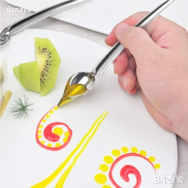 Независимо дали става дума за малинов сос за десерта, паста от уасаби за сушито или сос от подправки за красива чинийка с основно – умелото декориране никога не е било по-лесно! С фината лъжица за декориране можете да създадете спирали, вълни, точки или дори надписи върху всяко ястие. Просто вземете малко сос, поставете върха на декоратора върху чинията и я плъзнете върху чинията.