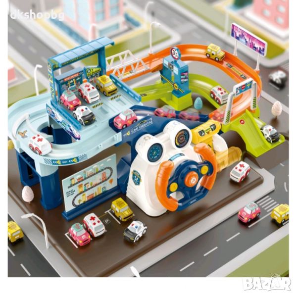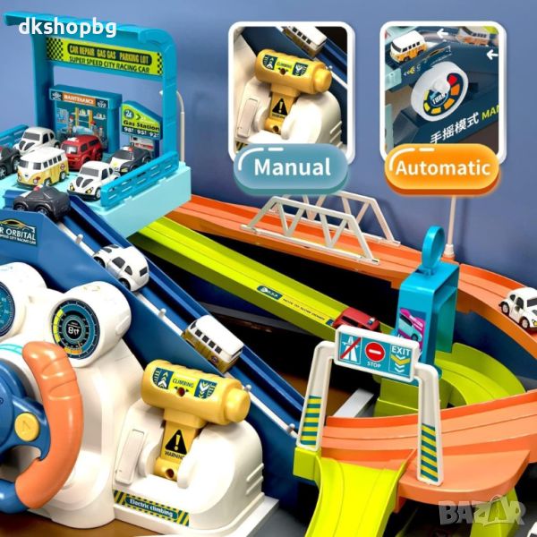 Автомобилната писта и пързалка с колички се явява истинско забавление, което не само развлича вашето дете, но и го запознава с основни принципи на физиката. С впечатляващо качество и наситени цветове, този комплект гарантира продължително и креативно забавление за децата. Пистата, мултифункционалния волан и аксесоарите включват пълноценен паркинг, хеликоптер, 8 уникални коли, 3 паркоместа и електрически асансьор.