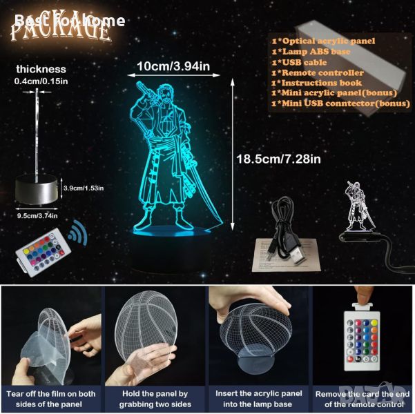 【3D ефект】: Това е голяма изненада, в тъмнината на мястото, където можете да видите 3D скулптура, но всъщност е двуизмерна илюзия, направена от плоско (3 mm) акрилно стъкло, гравирано с 2D гравиране изображение на повърхността. Чрез внимателно изчертаване на обектите извън линиите се създава ефект на 3D плътна текстура, покажете вашия цветен светлинен ефект, давайки перфектно визуално изживяване. 3D илюзионната лампа е практична и издръжлива със своето високо качество и уникален дизайн.