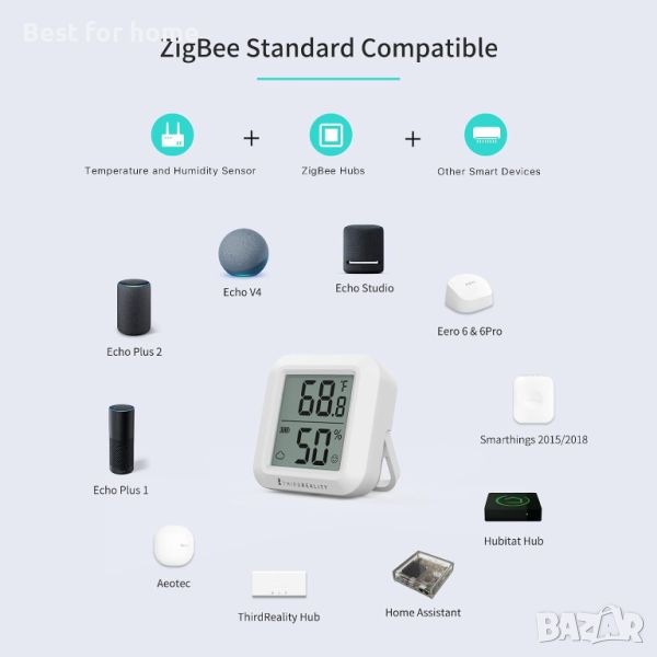ZIGBEE 3.0: Работи със съвместими Zigbee хъбове или Echo устройства с вграден Zigbee хъб, като Echo (4-то поколение), Echo Plus (1-во и 2-ро поколение), Echo Studio, Eero 6, Eero Pro 6, SmartThings 2015/2018 , Aeotec, Hubitat, Home Assistant, Homey Bridge, Homey Pro и Third reality Hub. ЗАБЕЛЕЖКИ: ZigBee Hub е необходим и се продава отделно.