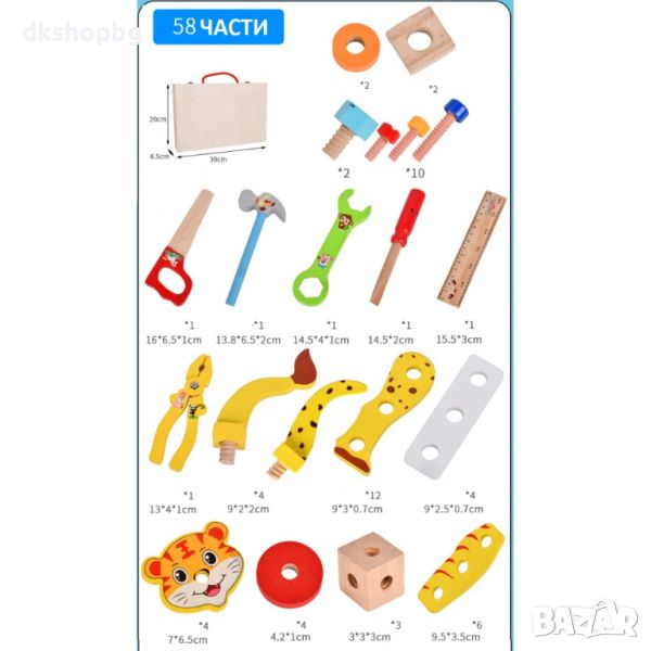 Дървено куфарче с дървени инструменти, болтове, части за животни - общо 52 части