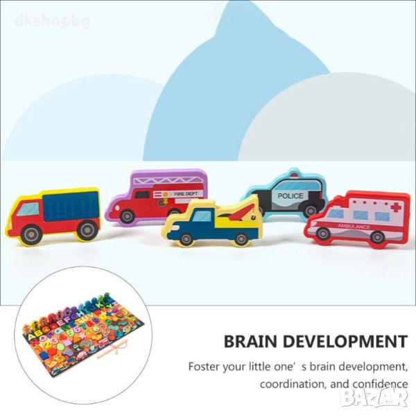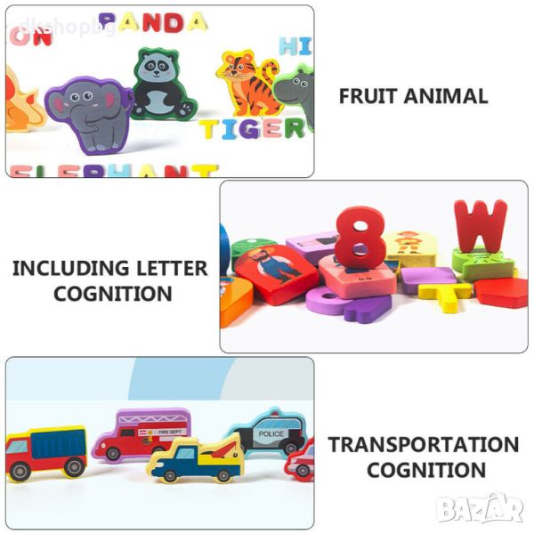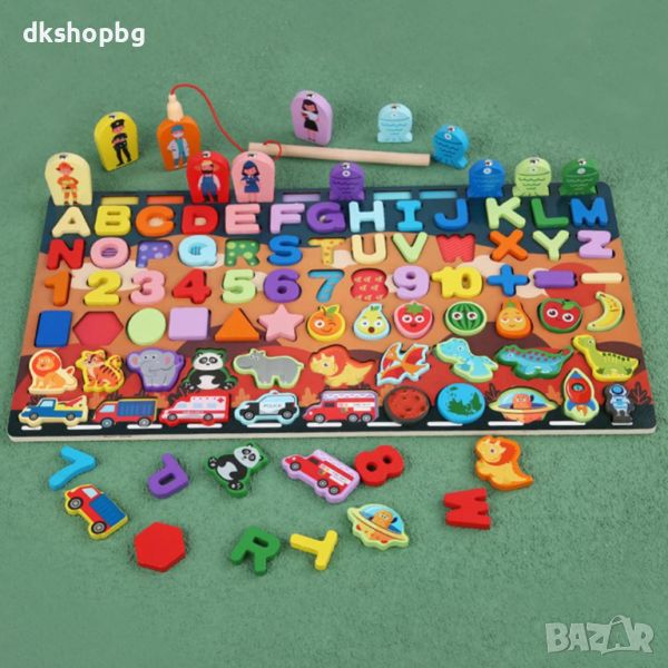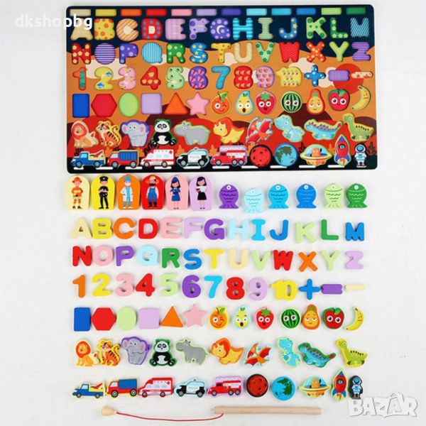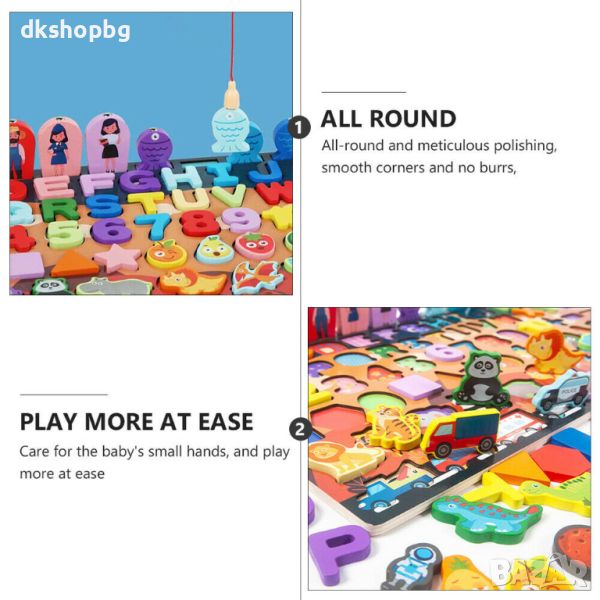 "Нашите детски пъзели за сортиране предлагат иновативен начин за учене и забавление. Състоящ се от букви, цифри, плодове и рибки, този учебен комплект е перфектен за развитие на различни умения.