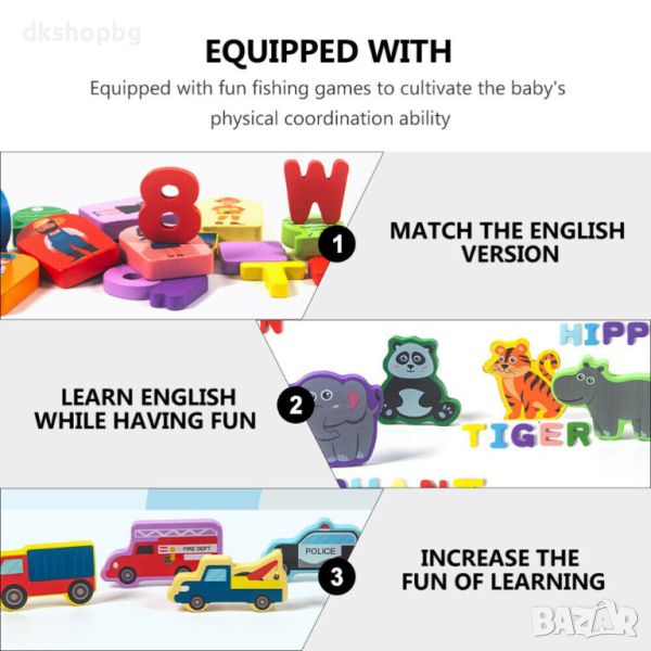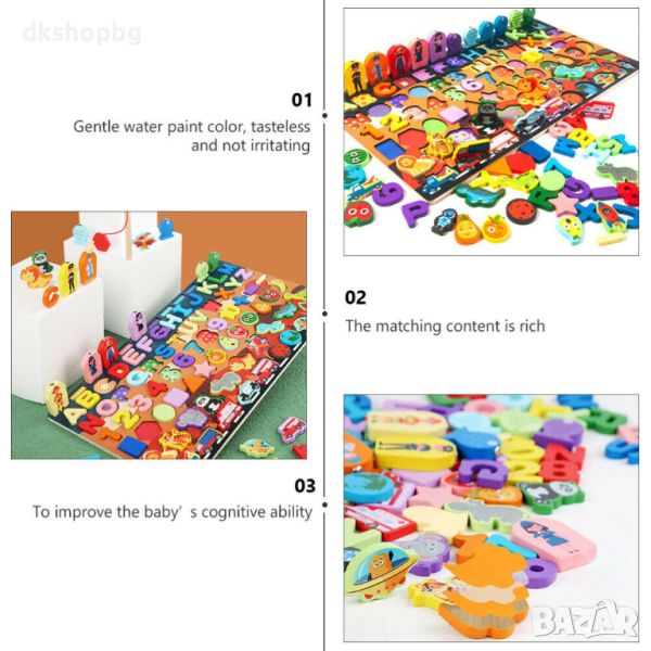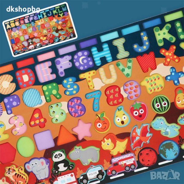 Всеки елемент от пъзела представлява различен аспект на обучението - буквите и цифрите насърчават езиковото и математическото развитие, докато формите на плодовете и рибките стимулират визуалното и тактилното възприятие.