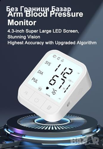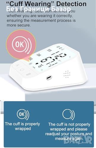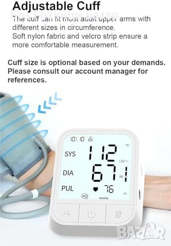 Включва 4 AAA батерии и маншет за горната част на ръката с обиколка 22-42 см