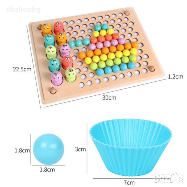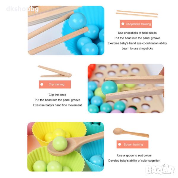 Задачата на децата е да поставят цветните дървени топки правилно върху перфорираната подложка, за да съвпадат правилно цветния шаблон (цветният шаблон се поставя под дървената рамка с отворите на топката), докато децата могат да използват някой от трите инструмента, за да хванат топки., дървена лъжица, щипки или клечки.