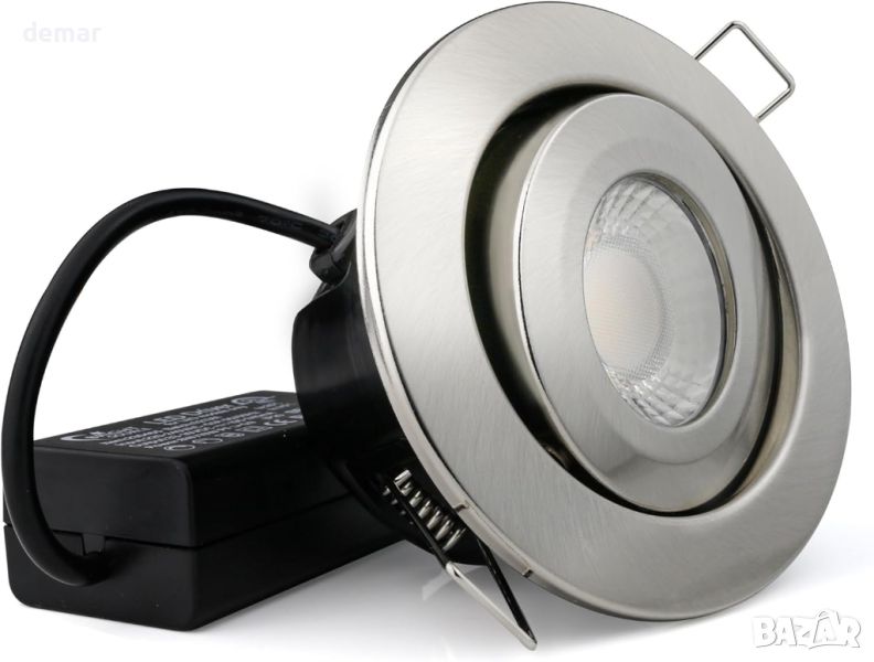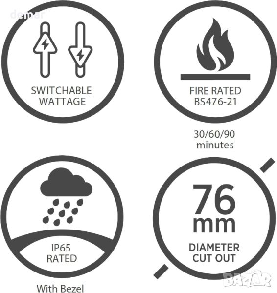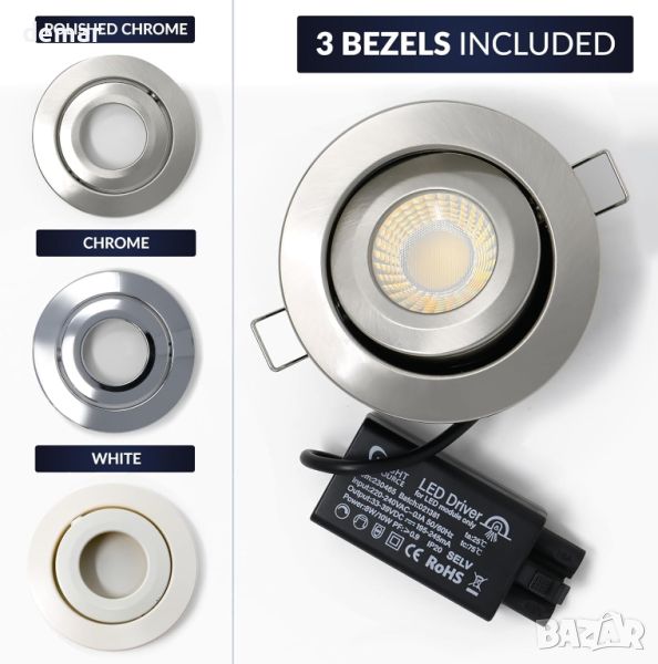 Bright Source All In One Tilt Switch LED Downlight е универсално решение за осветление с регулируема мощност между 8 W и 10 W и възможност за промяна на цветните температури от топло 3000 k, до хладно 4000 k или дневна бяла светлина 6000 k. Той разполага с три взаимозаменяеми рамки от полиран хром, стомана и бяло, за да пасне на всеки декор, и предлага наклон от 25 градуса за насочено осветление. Компактен по размер (56 mm x 100 mm x 100 mm с диаметър на изреза 76 mm), той има 60-градусов ъгъл на лъча и осигурява 700-950 лумена в зависимост от мощността. Тази издръжлива лампа има живот от 50 000 часа, има класификация IP65 за устойчивост на влага и отговаря на BS476-21 за 30/60/90 минути пожароустойчивост.