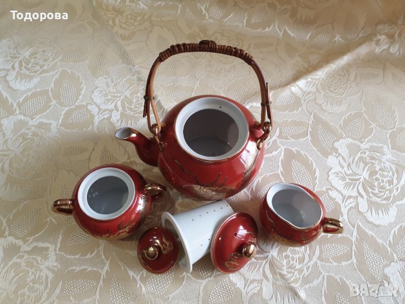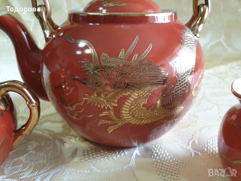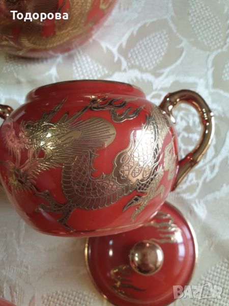 Японски порцеланов сет- чайник,захарница и латиера.Фин порцелан ,ръчно изрисуван златен дракон на фона на кораловочервен цвят.