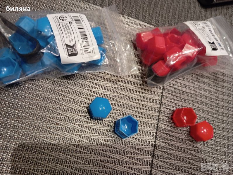 Нови, пластмасови предпазни капачки 17 мм.Останаха само сини,20 броя в комплект.Бонус-щипка за премахване