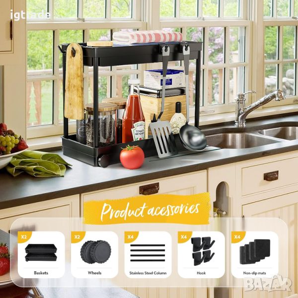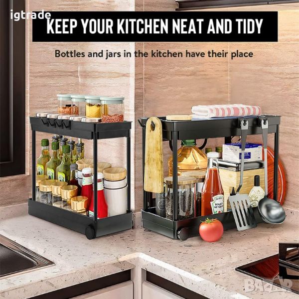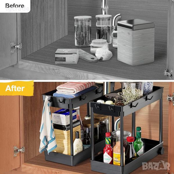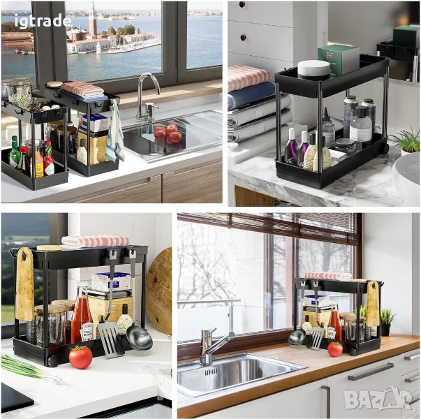 Регал под мивката, 2 нива на шкаф, органайзер за под мивката с 8 куки и 4 колела, органайзер за баня