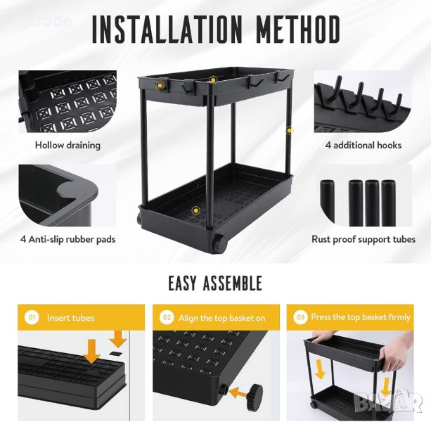 【Лесен за почистване】Двустепенният органайзер под мивката може да съхранява повече предмети на същото пространство. Кошницата е изработена от висококачествен ABS пластмаса, която не ръждясва, а кухият дизайн не задържа вода. Просто избършете с влажна кърпа.