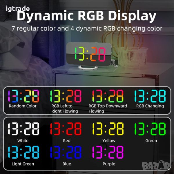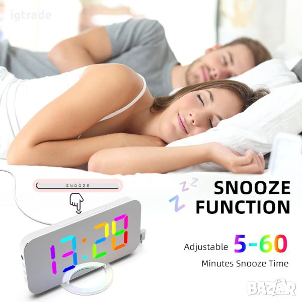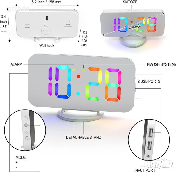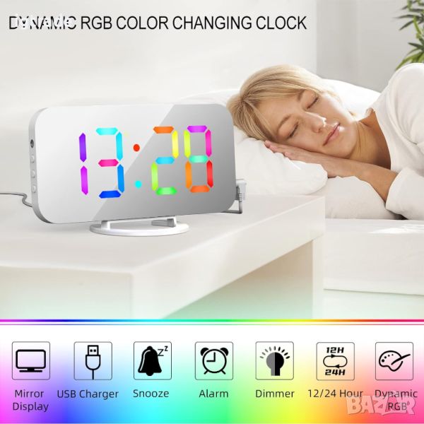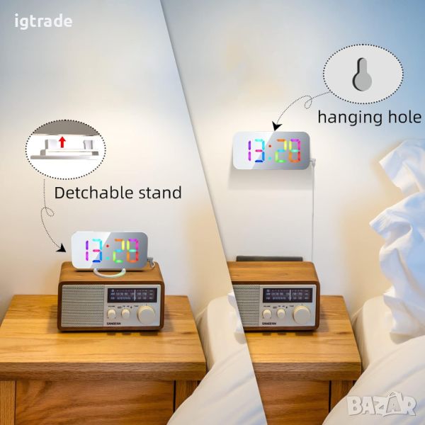 ⏰Дигиталният будилник разполага с LED дисплей, USB зареждане, един будилник, режим на отлагане, 12/24H режим, 3 нива на яркост, огледална функция.