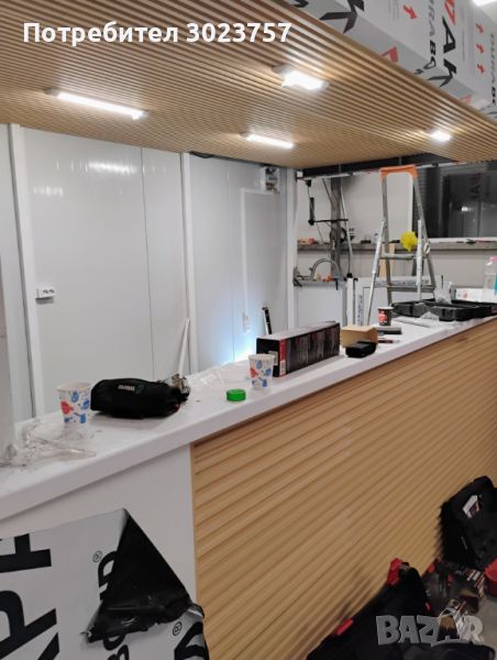 -стени : сандвич панел 4см ,цвят бял. Фасадата и козирката са изпълнени с еталбонд . Декорация под външен плот - PVC панел.