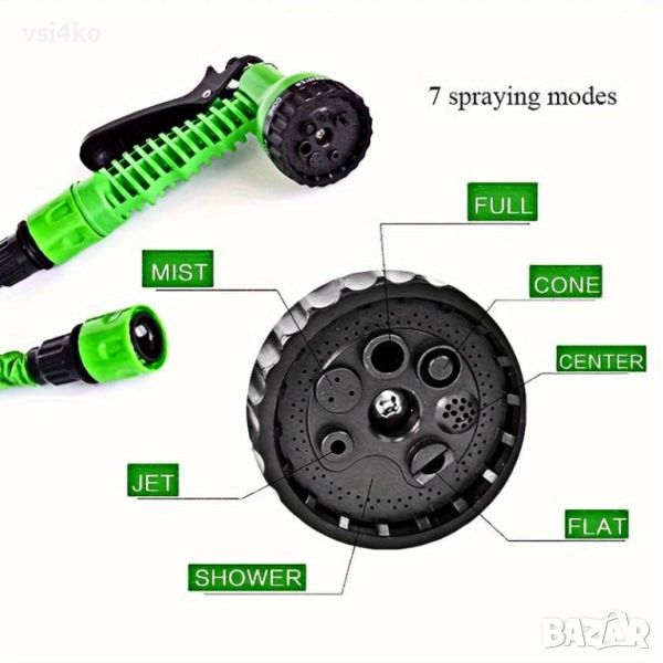 Пистолет със 7 функции: Интегриран пистолет за поливане с 7 различни режима, което позволява на потребителя да регулира потока и вида на водата според нуждите на градината.