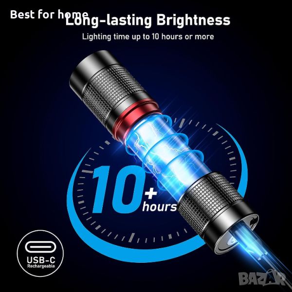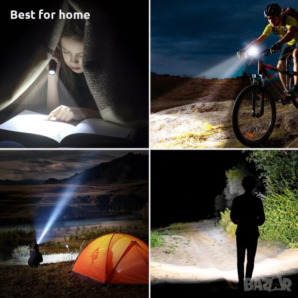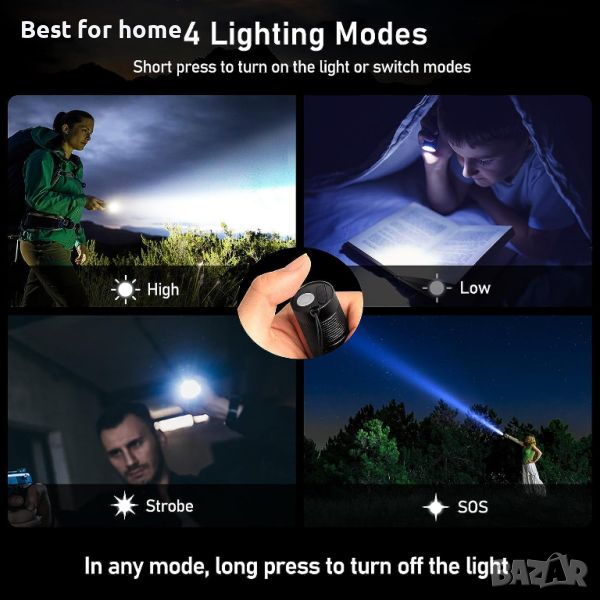 【4 режима на осветяване и възможност за мащабиране】Контрол с един бутон на 4 режима на осветяване: Силно/Ниско/Стробоскоп/SOS. Дизайнът на фенерчето с възможност за мащабиране регулира фокуса според нуждите, като ви дава свободата да изберете прожектор или прожектор за дълги разстояния или по-големи осветени зони.
