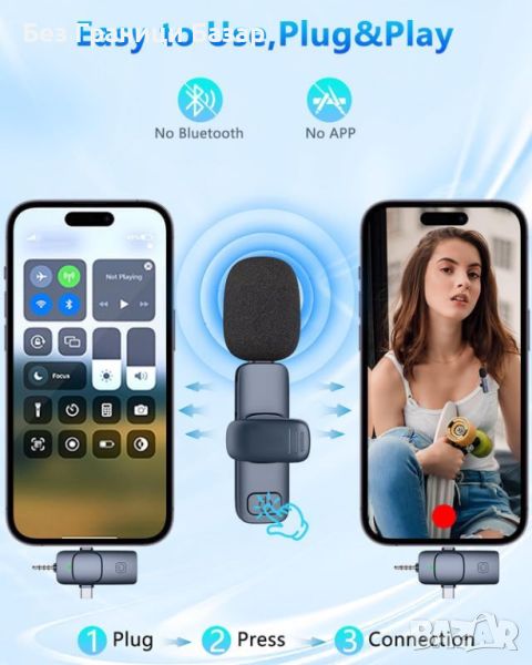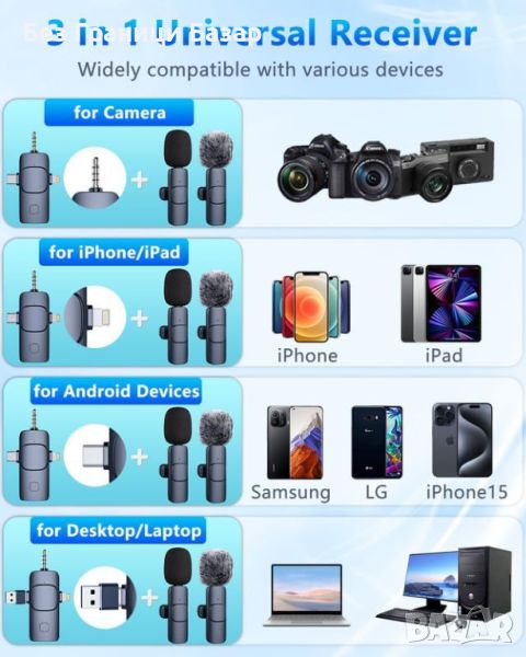 Безжичен лавалиерен микрофон за камера, iPhone, Android, компютър и iPad