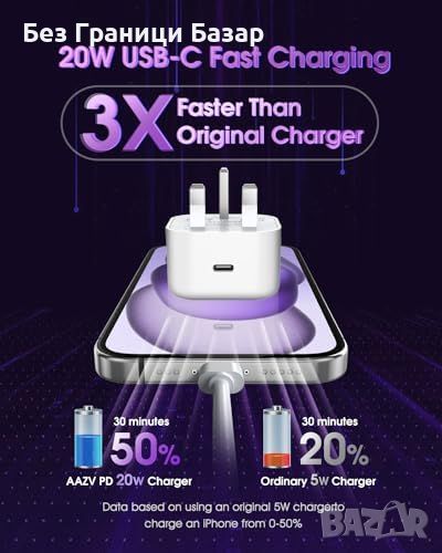 - Бързо зареждане: 20W USB C зарядно зарежда iPhone от 0% до 50% за 30 минути.