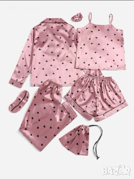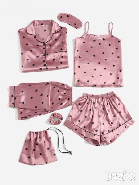 Сатенен дамски комплект от седем части, съдържащ къси панталонки ,потник ,риза ,дълъг панталон ,ластик ,лента за очи и торбичка.
