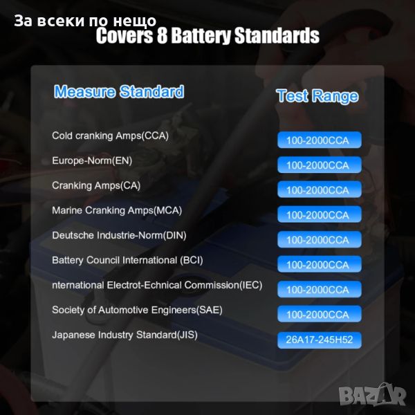 4. Стандарти за изпитване: CCA, BCI, CA, MCA, JIS, DIN, IEC, EN, SAE и GB;