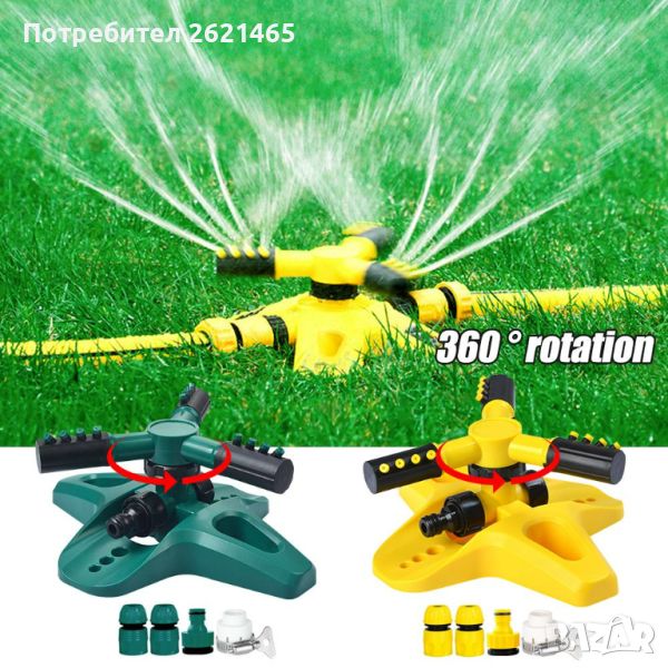- Тази градинска пръскачка е проектирана с 3 рамена и 12 вградени дюзи, върти се автоматично на 360 градуса с постоянна скорост благодарение на налягането на водата в домакинството.