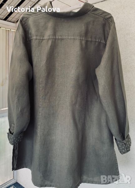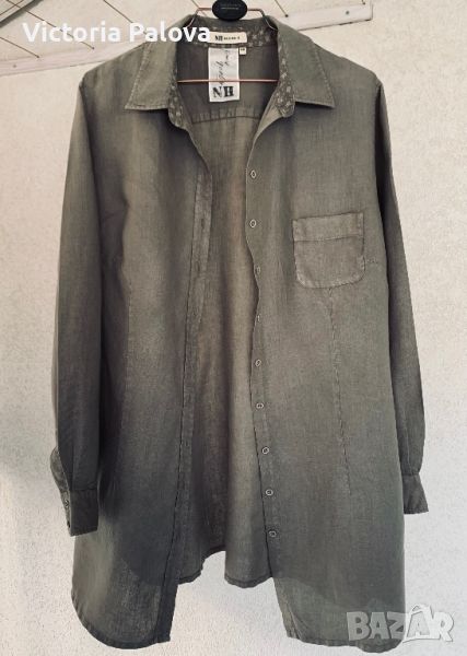 Супер удобна риза или туника с цепки отстрани (18см), цвят olive, качествен гладък лен. Рамо - 46см, ГО - 62см, дължина - 88см, ръкав - 63см.