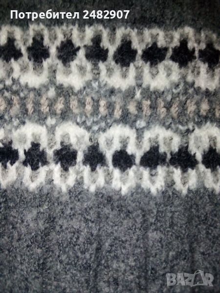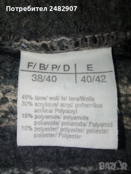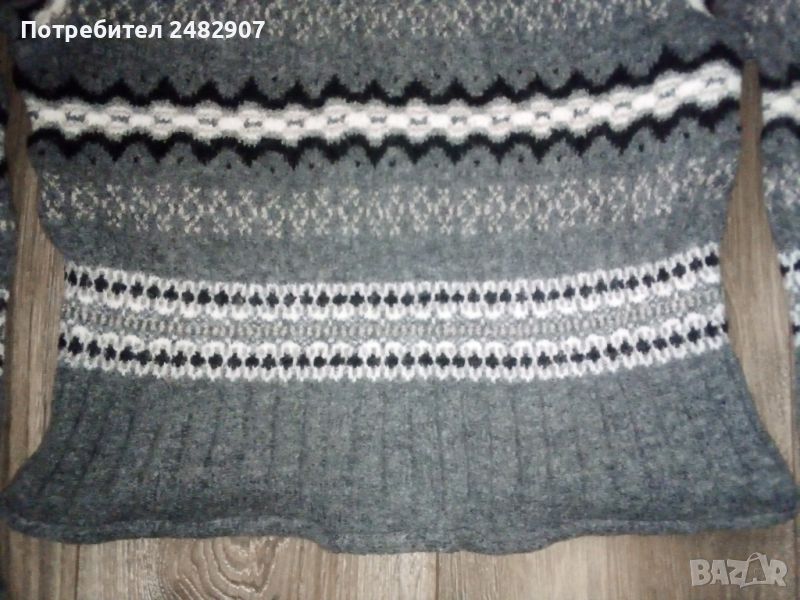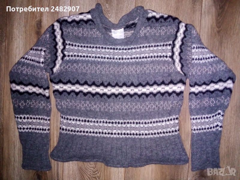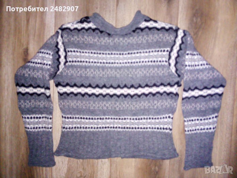 Машинно плетена сива дамска блуза, размер XS. Съдържа 45 % вълна, 30 % акрил, 15 % полиамид и 10 % полиестер. Ширина в раменете - 36 см, ширина под мишниците - 43 см, ширина в долната част - 43 см, дължина от рамото до долу - 47 см, дължина на ръкава от рамото - 47 см, ширина a ръкава в долната част - 9 см. Много запазена, почти не е използвана.