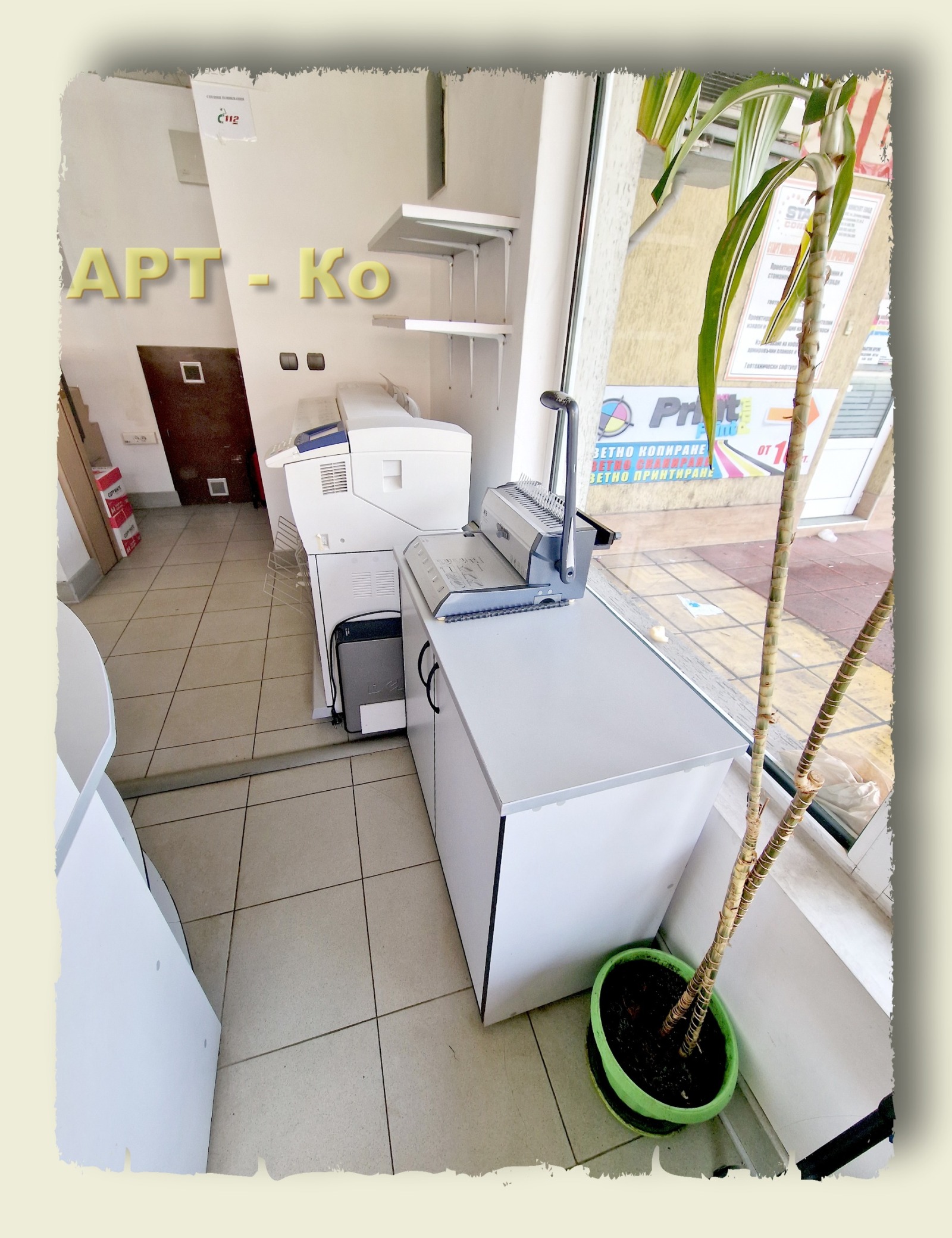 КОД 3649; Утвърден копирен център в търговски център Перник-Димова махала. Ситуиран е до Т-маркет, аптека, спирка на градски транспорт и други разнородни магазини, което говори за постоянен човекопоток. Копицентъра се предлага напълно оборудван с всичко необходимо за дейността. Освен офисните мебели включва още, но не се ограничава само до инженерна машина със скенер XEROX 6204 за копиране и разпечатване на чертежи, цветен плотер IPF CANON 830 за широкоформатно копиране и разпечатване, копирна цветна машина XEROX формат А3 и А4 и други. Към търговската зала има и сервизно помещение.