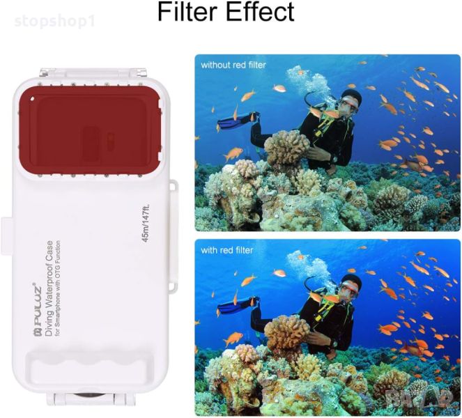 - Антирефлексно стъкло за висококачествени снимки, задна и предна камера. ясен изглед на изображението и лесно управление под вода. Има 1/4 отвор за винт, можете да го инсталирате на професионално фотографско оборудване като монопод, статив или стабилизатор.