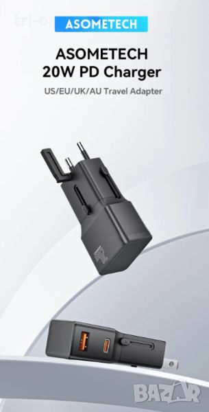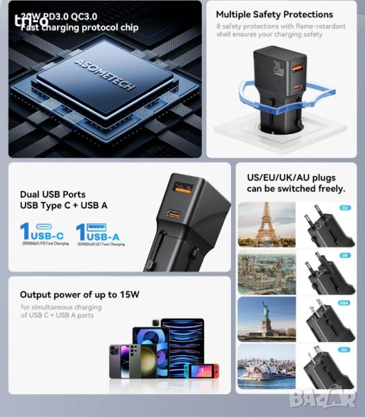 ASOMETECH Универсален адаптер бързо зарядно с 1 USB QC 3.0 порт и 1 PD 20W Type-C за EU/UK/USA/AUS.