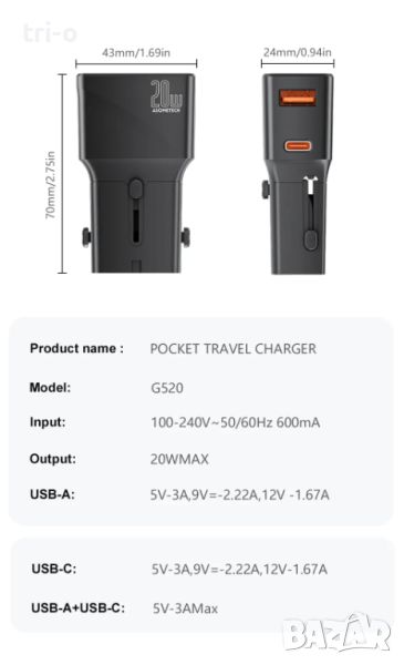 【Usb qc3.0 & Type C PD 20W универсален адаптер за пътуване】