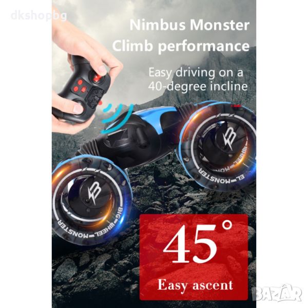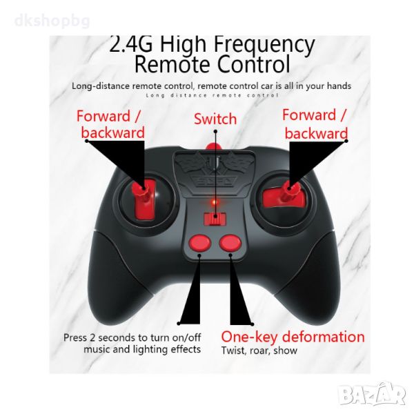 Една невероятна играчка, която гарантирано ще зарадва вашето дете, тази иновативна кола с дистанционно управление може да се движи напред, назад и настрани, както и да се върти на 360 градуса, с едно докосване на бутона се повдига на амортисьорите си като така се превръща в офроуд бъги, а когато е в спортен режим се снижава близо до земята, което позволява да развие максималана скорост от 25 километра в час.