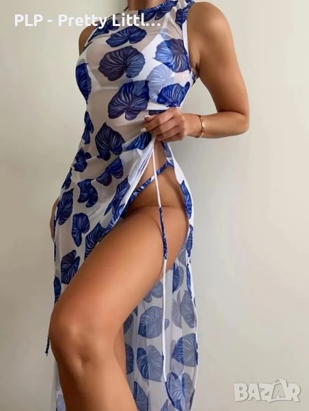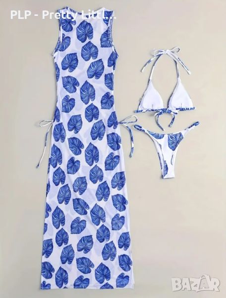 Един отличен избор за стилна визия, е този модерен плажен комплект с многоцветен десен.