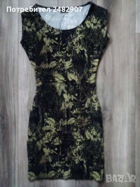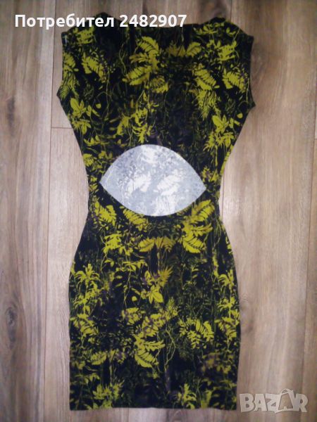 Страхотна дамска рокля с ефектен гръб в черно и зелено, размер S. Съдържа 95 % памук и 5 % спандекс. Ширина в раменете - 43 см, ширина под мишниците - 45 см, ширина в долната част - 38 см, дължина от рамото до долу - 88 см. Много запазена, обличана веднъж за повод, отлично състояние, без забележки, неразличима от нова.