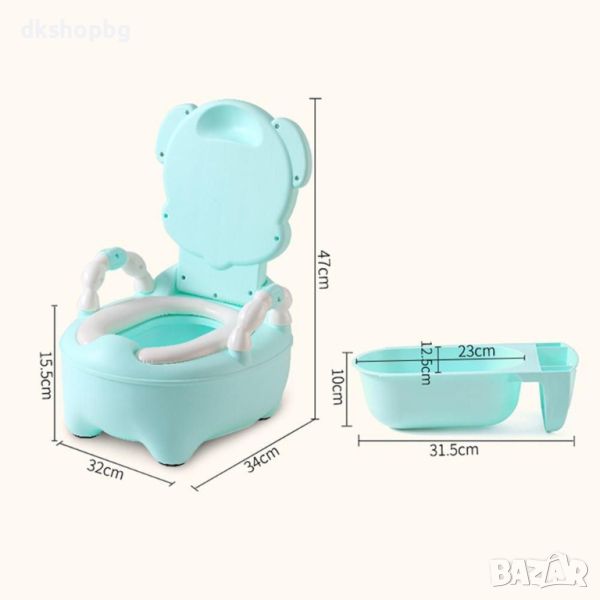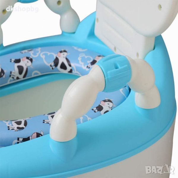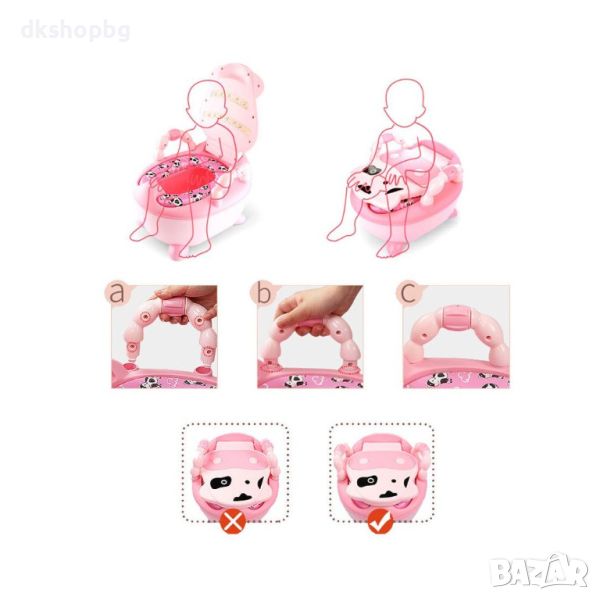 Продуктът е с формата на тоалетна чиния; капаче, което се вдига и сваля; вътрешно изваждащо се контейнерче за лесно почистване; дръжки от двете страни на седалката на гърнето, които осигуряват допълнителна сигурност и комфорт на детето. Специално направено с дизайн с Кученце и Кравичка, за да привлича детското внимание, улеснявайки процеса на приучване към използването на гърнето. То е изработено от висококачествена и лесно почистваща се материя.
