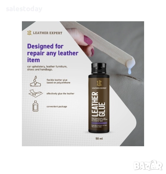Leather Glue се използва при ремонт на различни видове кожа, обувки, аксесоари и чанти, както и в автомобили и кожени мебели. Използва се за естествена кожа. Не използвайте върху велур и набук.