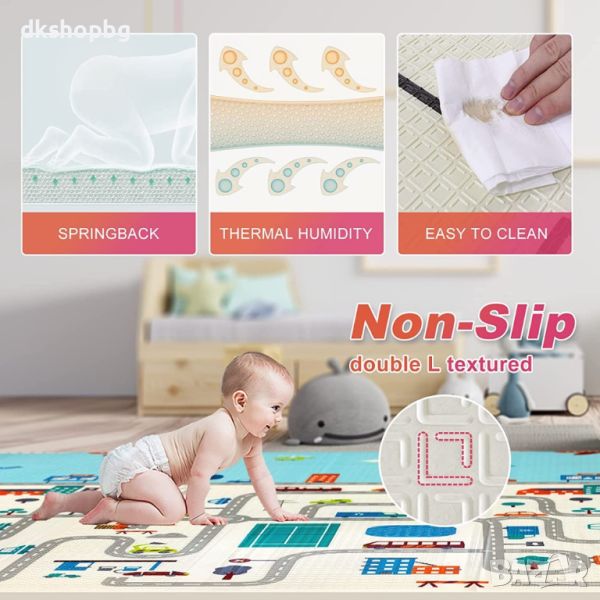 Килимчето изолира перфектно от студеният под. Меко е и комфортно, но в същото време достатъчно плътно и устойчиво на натиск. Чудесно буферира и обира удара при евентуално падане на детето. Осигурява защита на костното развитие на бебетата, като предпазва коленете при пълзене.