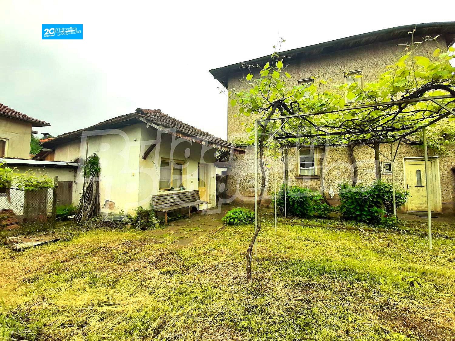 Дворът на имота е с площ от 450 кв.м. и включва постройка с една стая за живеене и санитарен възел, стопански постройки, гараж и навес с пещ за кулинарни изкушения.