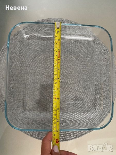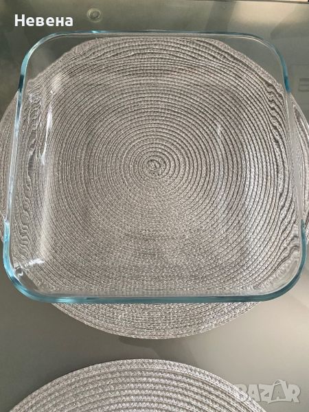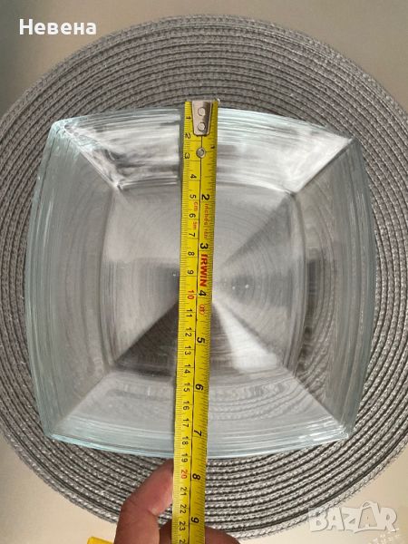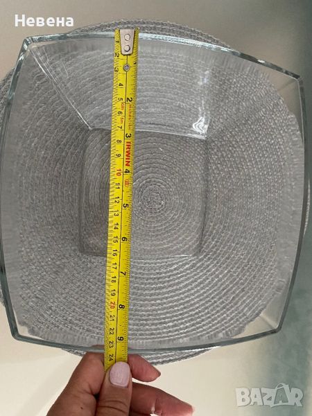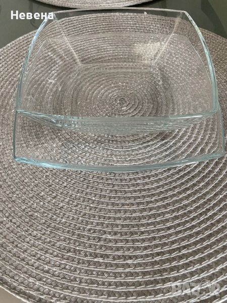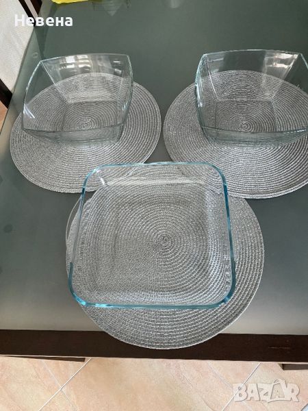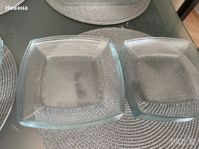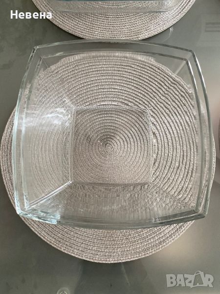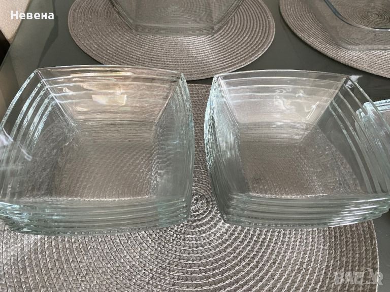 Стъклен сервиз за хранене,състоящ се от стъклена квадратна тавичка термоустойчива,2 голямо квадратни купи за салата,9 квадратни плоски чинии и 10 квадратни дълбоки чинии,в които може да се сервира салата,паста и др. по ваш избор.Целият сервиз е в отлично състояние.На последните снимки съм снимала размери на тавичката,купите за салата,плитките чинии и квадратните дълбоки чинии.