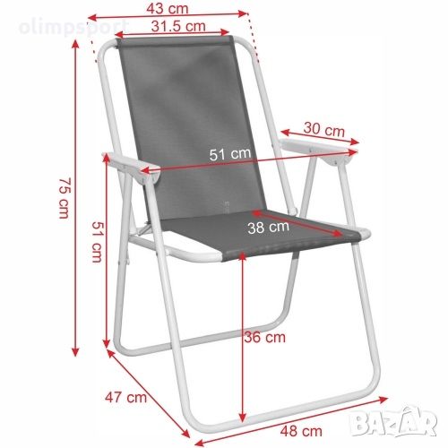 Лек, компактен и удобен сгъваем стол за използване на открито. По-здрав и устойчив на различни атмосферни условия, поради факта, че е изработен от стомана и textilene - мрежест, дишащ, здрав, бързосъхнещ материал, което прави стола подходящ за градина, тераса, плаж, къмпинг. Височина облегалка - 75 см. Височина седалка - 36 см. Размери седалка - 43х38 см. Дължина подлакътник - 30 см. Ширина стол с подлакътниците - 51 см. Заемана подова площ - 48х47 см. Размери сгънат - 67х51х5 см. Тръбна стоманена рамка с диаметър - Ф18 мм. Тегло на стола - 2 кг. Максимално натоварване - 90 кг.