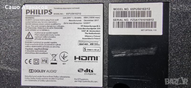 Модули от телевизор PHILIPS 65PUS6162/12 със счупена матрица (панел: TPT650U2-FN04.S REV:SG01F )