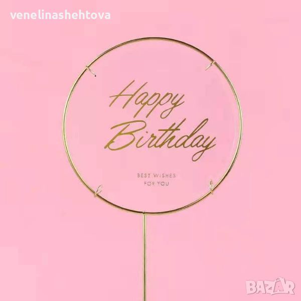 Прозрачен кръгъл топер Happy birthday Честит рожден ден с метална основа → Обява 45854033