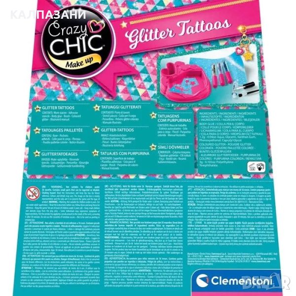 Комплектът съдържа: работна основа, лепящи шаблони, лепило за тяло 1,2 гр, четка, цветни брокати 3 гр.