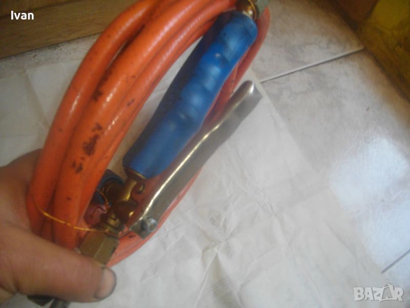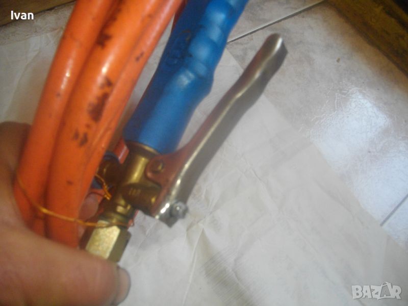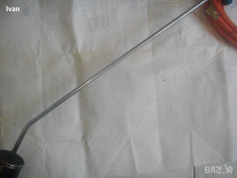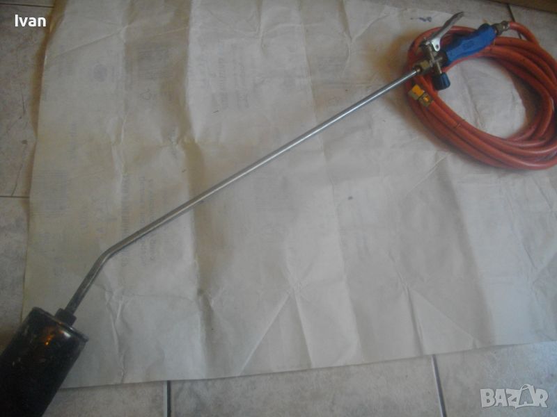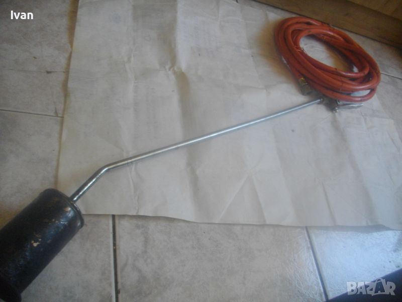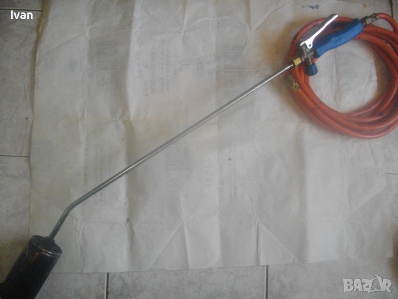 Газова пропан-бутан горелка 87 см дълга за хидроизолации покриви CFH с маркуч 5 м - цена 179 лв. Почти нова, в отлично работно състояние. Маркуч 5 м. отличен, без забележки. Горелка дължина 87 см, чашка отпред ф 70 мм, 6 дупки за пламъка. Ръкохватка на горелката - с метален спусък, гайка на маркуча за вентил клапан М14. Тегло на горелката с маркуча - 1,3 кг. Цена 159 лв.