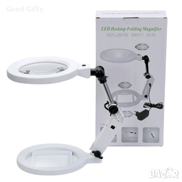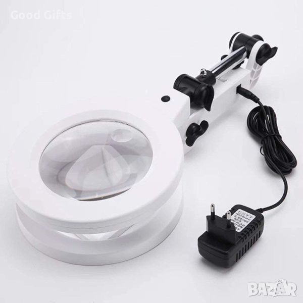 със стойка и силно LED осветление, което е с димер и може да се регулира, голямо увеличение и диаметър на лещата 2X и 5X чупещо се рамо на три нива за четене, шиене на гоблени, бродиране, бродерия, козметик, бюро, часовникарска за работа, злато, електроника, рисунки, рисуване, свободни ръце, телефон, монитор, компютър, монети, маникюр, платки, проверка на лична карта и банкноти, запояване, диаманти, документи, деца, декстоп, насекоми, маса, марки и др.