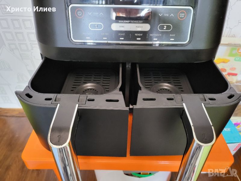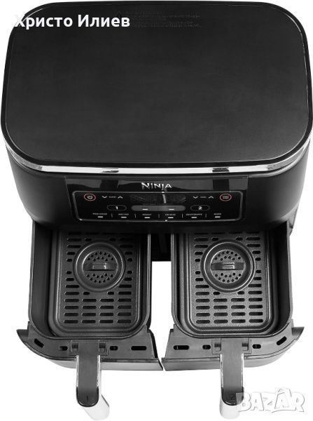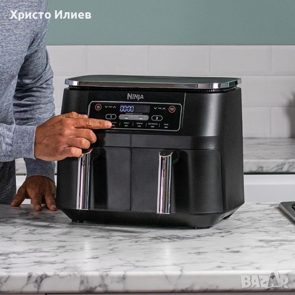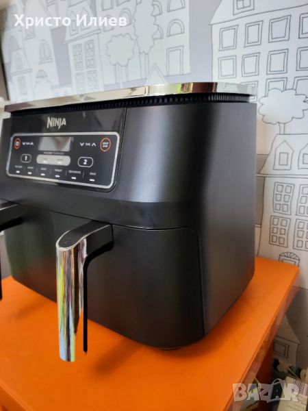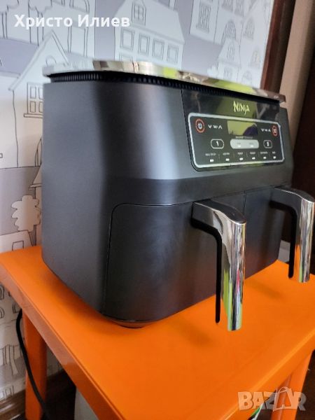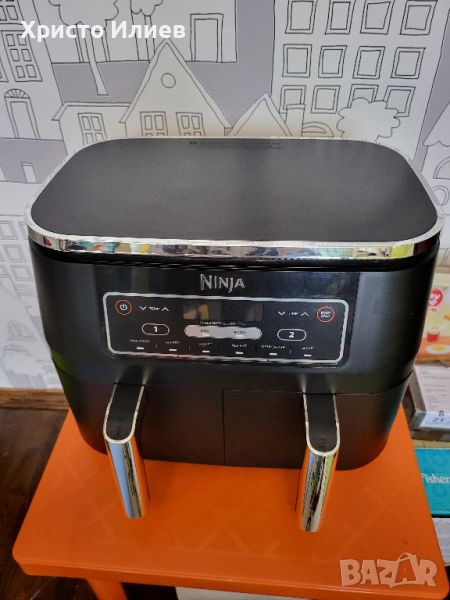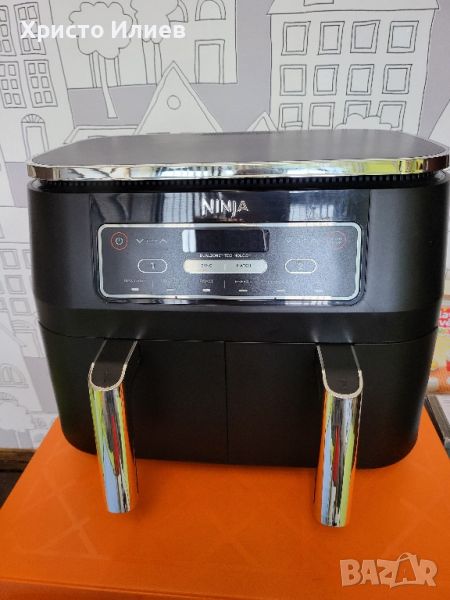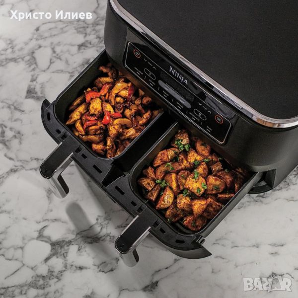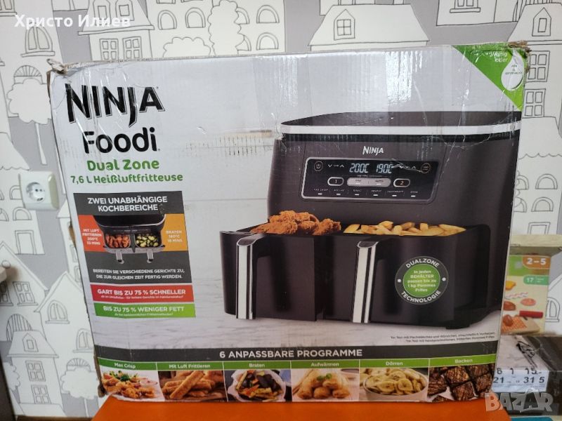 Работи без никакви проблеми. Няма никакви забележки. Има предоставени реални снимки. В оригинална опаковка.Спестете до 55% от разходите за енергия в сравнение с фурните с фритюрници с горещ въздух Ninja* (*Тестове и изчисления въз основа на препоръчителното време за готвене на колбаси при използване на функцията за фритюрник с горещ въздух в сравнение с две представителни фурни)2 НЕЗАВИСИМИ ЗОНИ ЗА ГОТВЕНЕ: гответе 2 храни по 2 начина, и двата едновременно. Използвайте различни функции, времена и температури във всяко чекмедже, за да приготвите пълноценни ястия в едно устройство или да отговорите на 2 вкуса.6 функции за готвене: Max Crisp, Air Fry, печене, печене, претопляне, дехидратиране. Гответе от замразено до хрупкаво. До 75% по-малко мазнини* при използване на функцията Air Fry (*Тестван в сравнение с пържен, ръчно нарязан чипс)Голям капацитет: гответе 4-6 порции. Всяко чекмедже побира до 1 кг чипс или 1,6 кг пиле. Гответе до 75% по-бързо от конвекторните фурни* (*Тествани с рибни пръчици и колбаси, включително предварително загряване).ВКЛЮЧВА: Двузонов дигитален въздушен фритюрник Ninja Foodi (EU щепсел), 2 x незалепващи 3,8-литрови чекмеджета, подходящи за миене в съдомиялна машина (общ капацитет 7,6 литра) и чистачки. Ръководство за рецепти, създадено от готвача Цвят: черенРазмери: H31.5cm x W38cm x D26.5cm Тегло: 8.2 kg.6 функции за готвенеПовече от фритюрник с горещ въздухИзберете от пържене на въздух, Max Crisp, печене, печене, претопляне и дехидратиране, за да създадете вкусни ястия, гарнитури и закуски. Лесните за разбиране контроли с функция за обратно броене правят готвенето детска игра. Пригответе замразени съставки без размразяване.До 75% по-малко мазнина в сравнение с конвенционалните методи за пържене* - с малко или никакво масло.От замразена храна до хрупкави резултати само за няколко минути при до 240 °C.От златисто печени картофи и пилешки гърди до балсамови сотирани домати.От тестени печива и бутер сладкиши до пресен хляб, торти и сладкиши.Затоплената храна има уникален аромат и вкус като току-що извадена от фурната. Перфектен за пица.