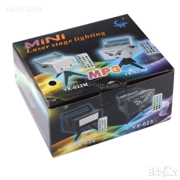 Двуцветен дискотечен лазерен ефект YX-022 със звуков контрол и дистанционно управление. Изобразява различни фигури в червен и зелен цвят. Захранване с адаптор 220VAC-5VDC 1000mA.